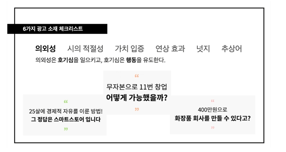 저번 글에서 우리는 마케팅의 10단계 전략을 배웠다. 10단계 마케팅 전략 (창업 후 고객 유치하는 방법) 마케팅의 중요성 아무리 제품이 좋아도 포장지가 좋지 않으면 소비자의 구매 욕구를 이끌어 낼 수 없다! 반대로 아무리 제품이 별로여도 포장지가 좋으면 팔 수 있다. 포장지를 먼저 만들어 팔 lifesavingcoach.tistory.com 여기에 더해, 광고에서 필수로 체크해야 하는 6가지 요소가 있다. 1) 그 첫 번째는의외성이다. 의외성은 호기심을 일으키고, 호기심은 행동을 유도한다 의외성을 얻으려면? 간단하다. 대치되는 단어를 이용하면 된다! "서울대생이 1000만원을 번 비법" 보다 "25살에 경제적 자유를 이룬 방법! 그 정답은 스마트스토어입니다" 라는 카피라이팅이 더 의외성을 가지고, 따라..